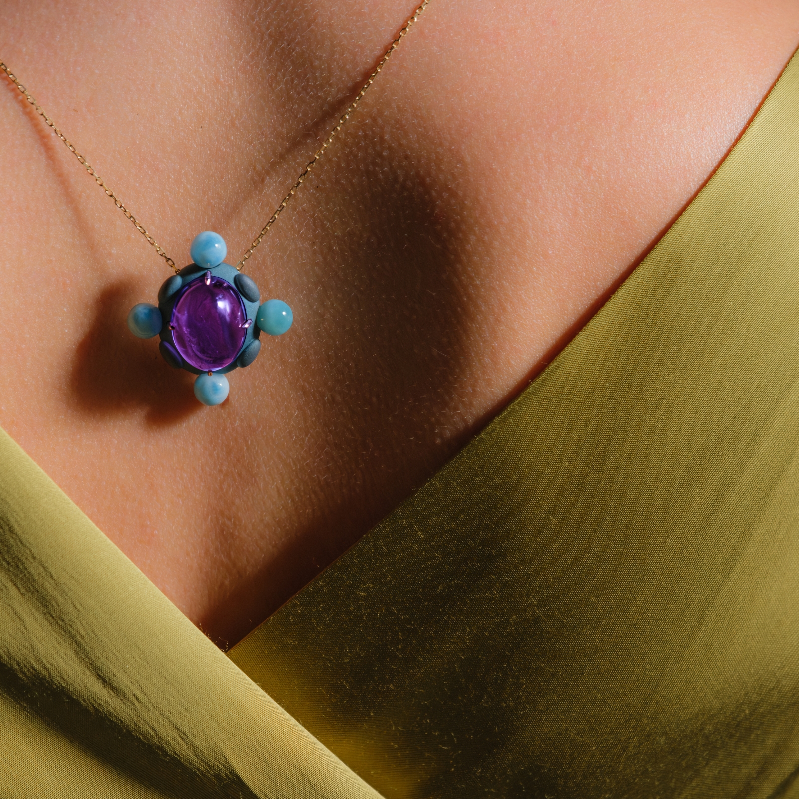 Amethyst and larimar converge in a cross form imbued with symbolism and intention bringing grounding and ethereal energies into perfect balance.
