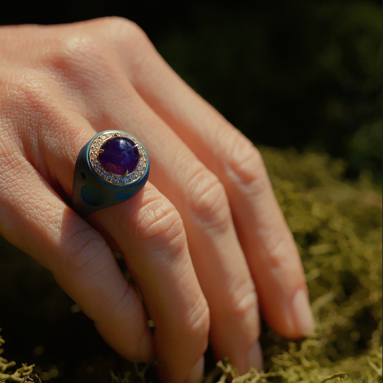 A violet amethyst emerges through a surface of pavé-set natural diamonds, where brilliance softens and depth unfolds with quiet allure. Amethyst set in anodized titanium and 18k gold.