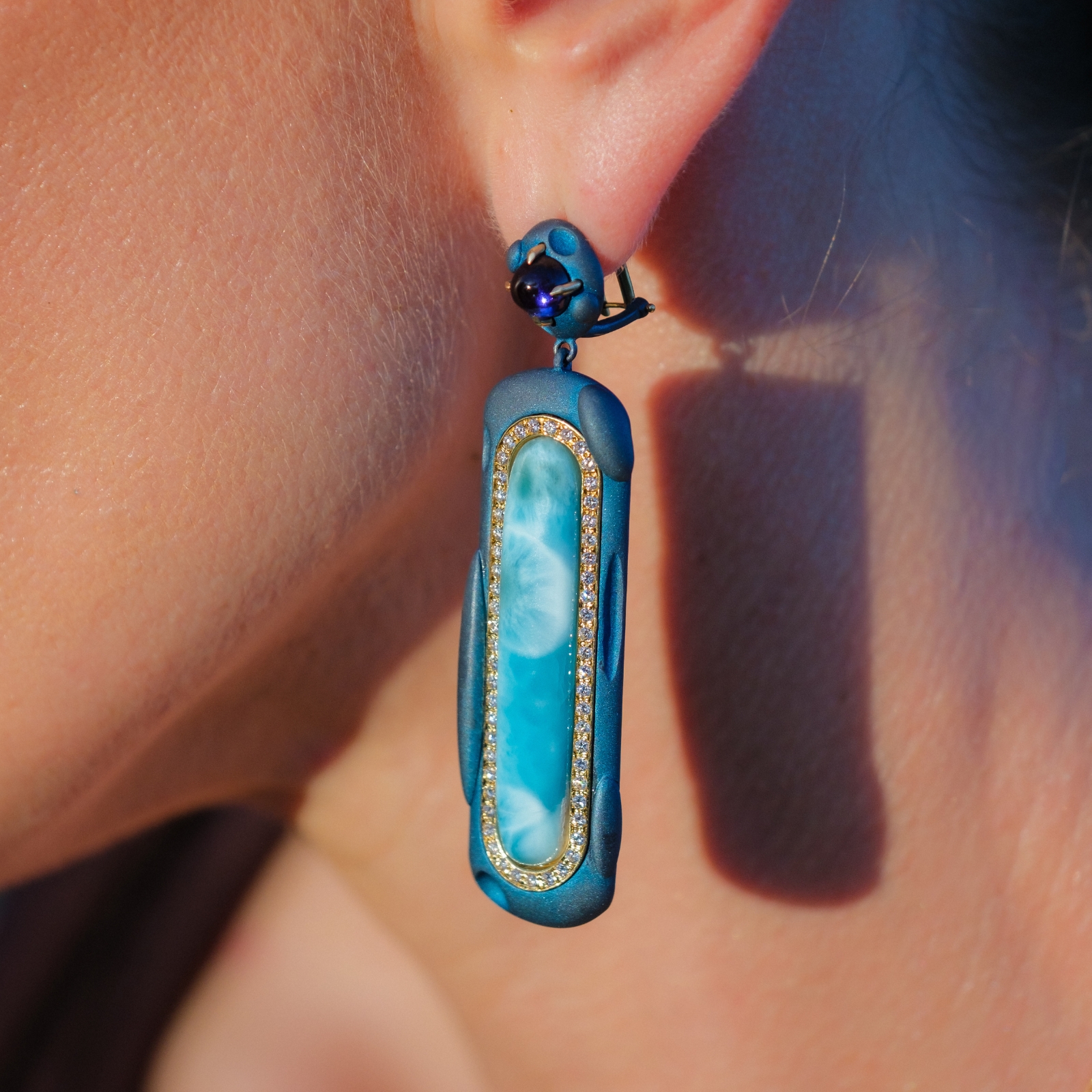 A dual composition of larimar and amethyst, accented by pavé natural diamonds that give light from within. A bold harmony of stones creates a layered radiance, both fluid and dimensional. Set in anodized titanium and 18k gold.
