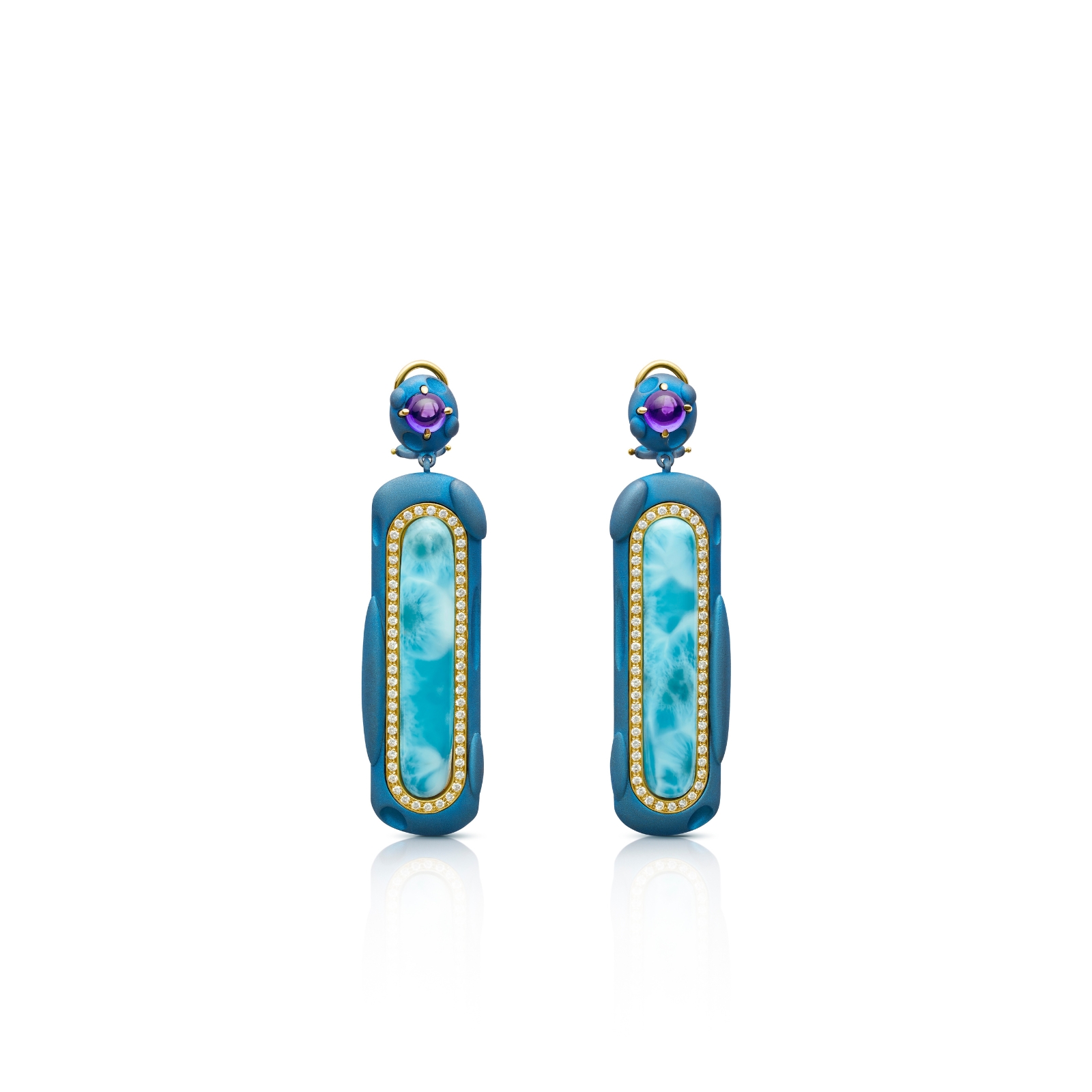 Larimar y amatista a dúo, con un acento de diamantes naturales en pavé que aporta luz en movimiento. Un conjunto audaz de gemas que resulta en una compleja luminosidad, fluida y dimensional.