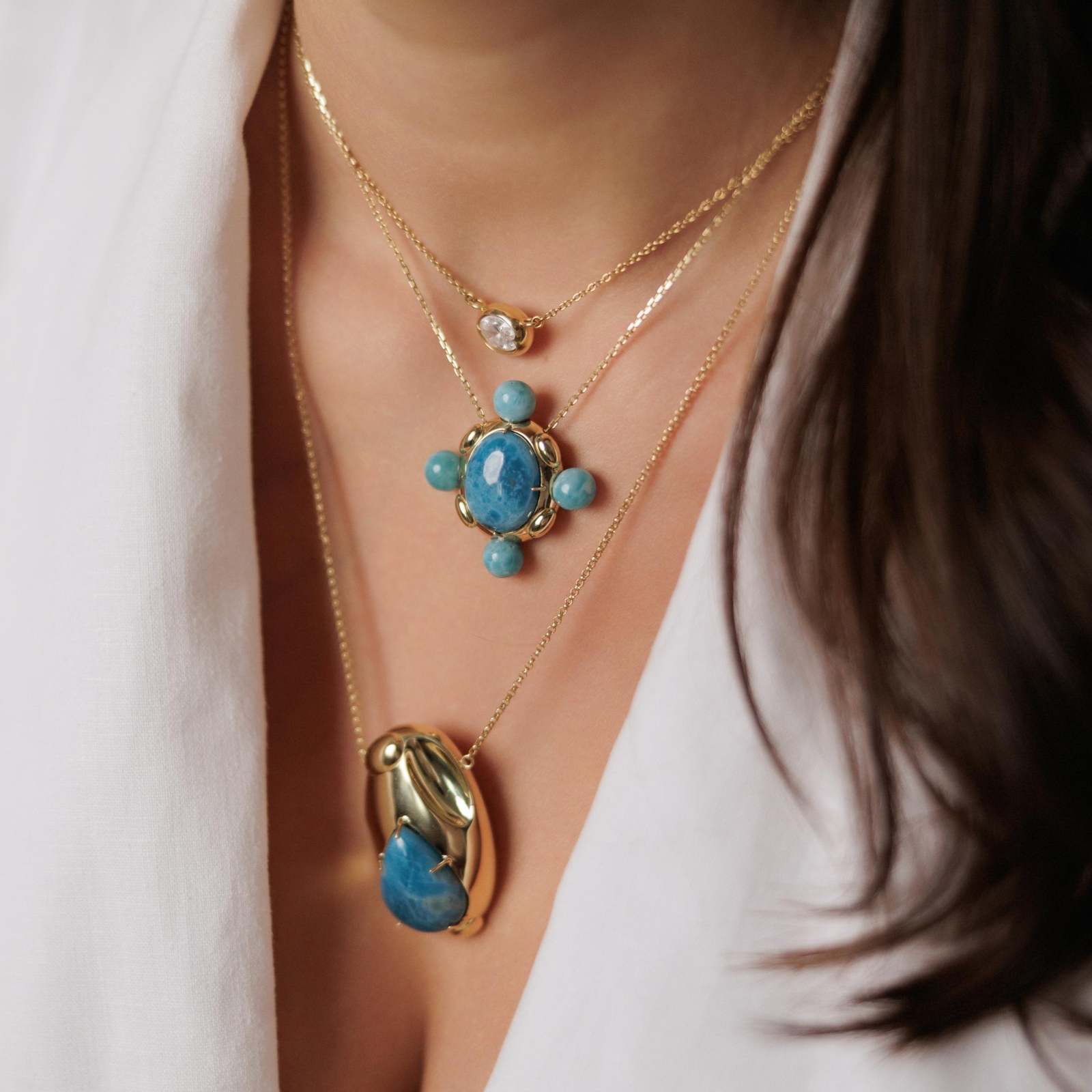 Una forma de cruz reinterpretada a través del larimar y líneas fluidas de oro. Íntima y luminosa, encierra un sutil sentido.