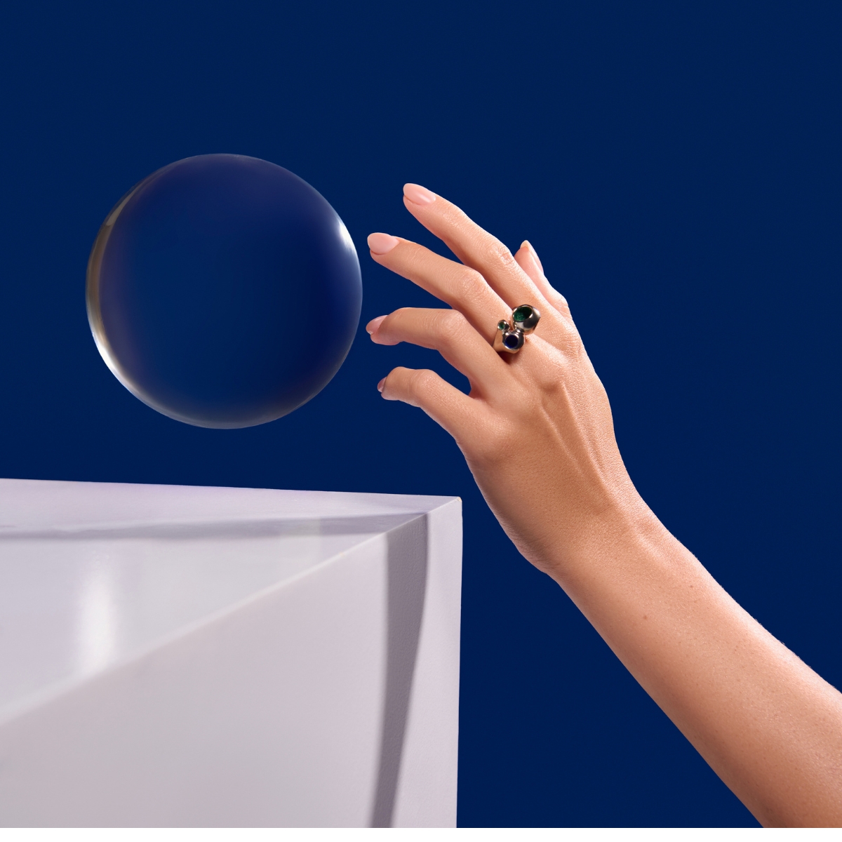 Three Huritá spheres align in a gesture of balance and continuity. The Caurel Triad Ring translates the language of the collection into a serene composition, where each form flows into the next, accompanying the natural movement of the hand. A piece that evokes harmony and permanence.